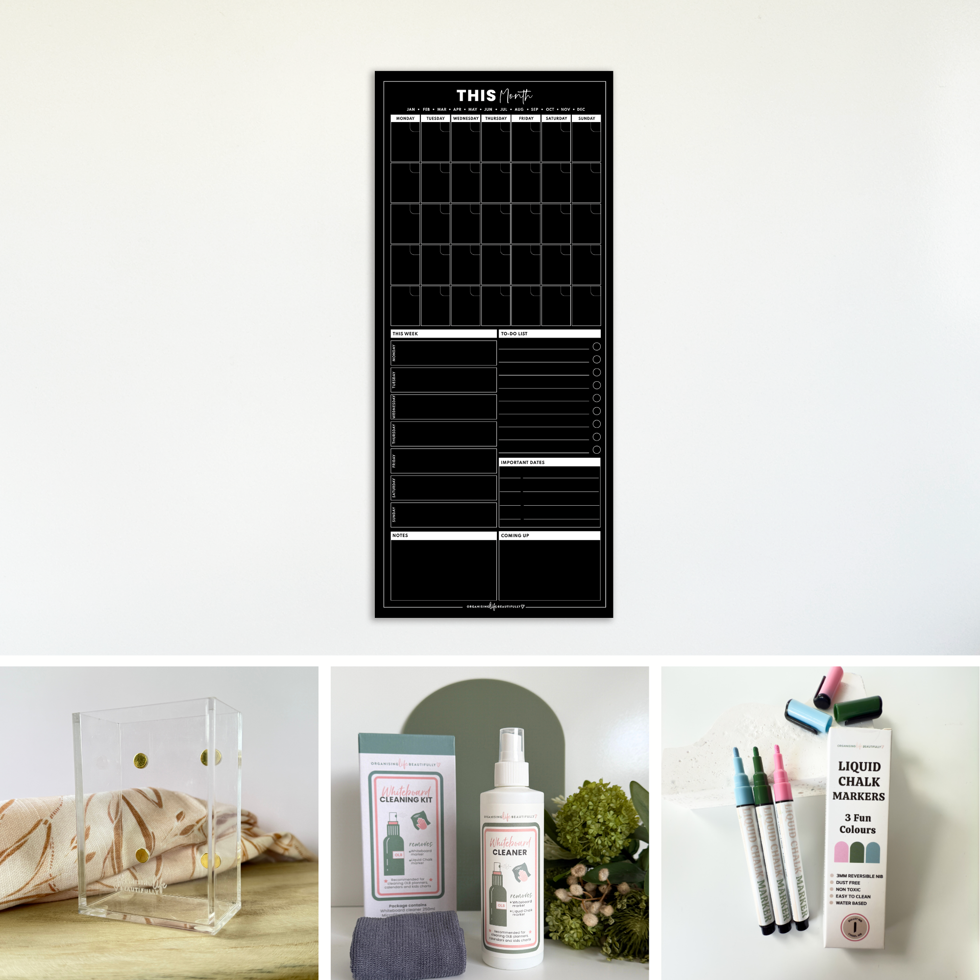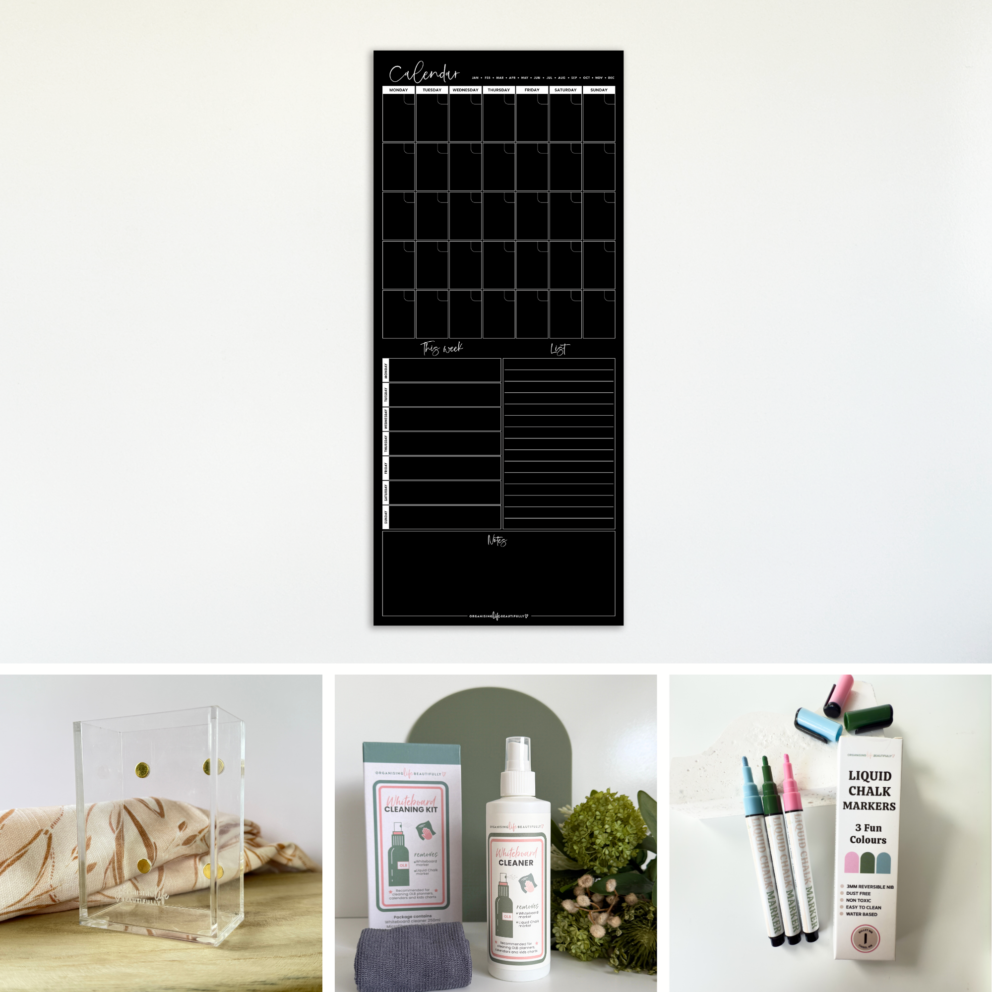 • OLB Cleaning Kit: 250ml whiteboard cleaner + microfibre cloth to keep your planner fresh.