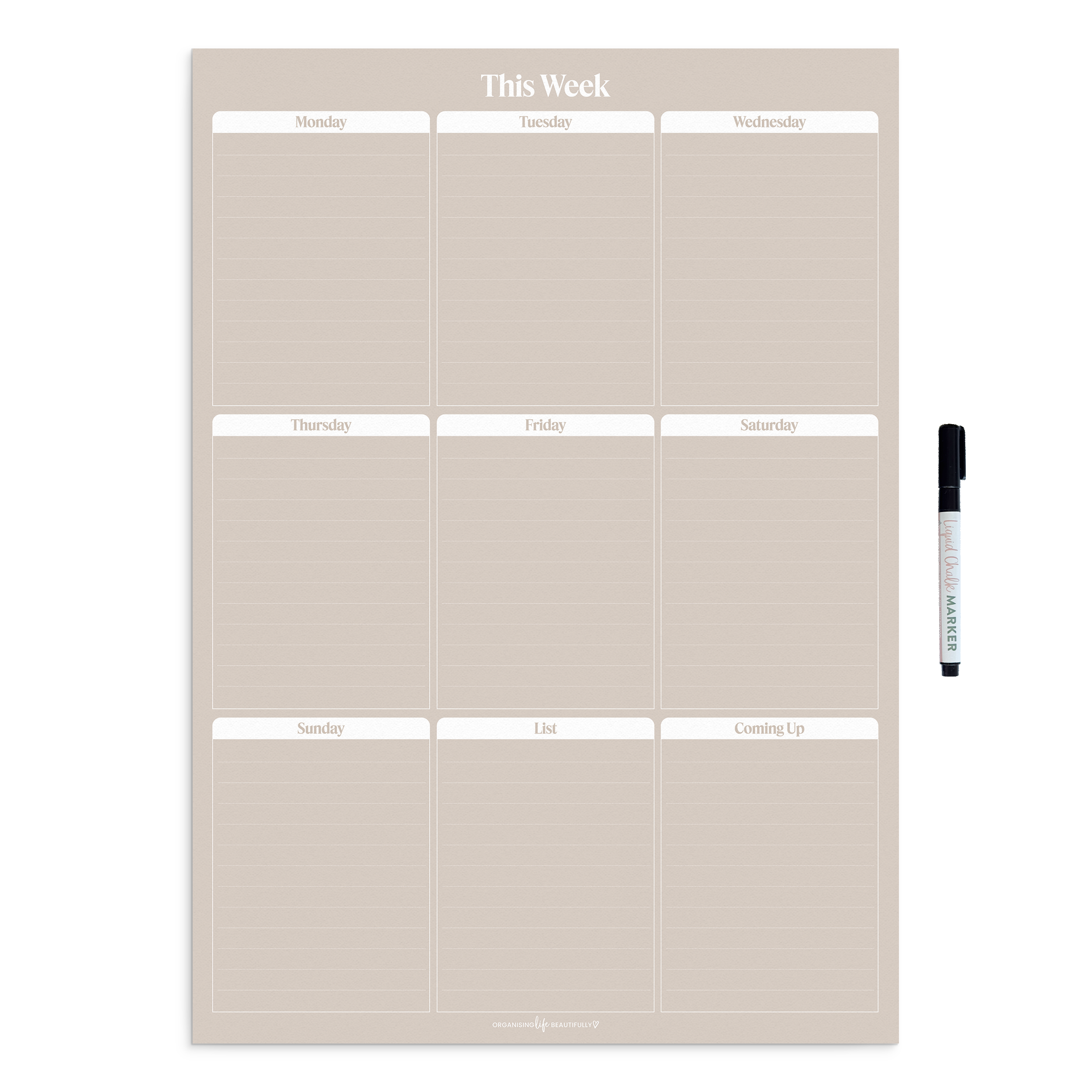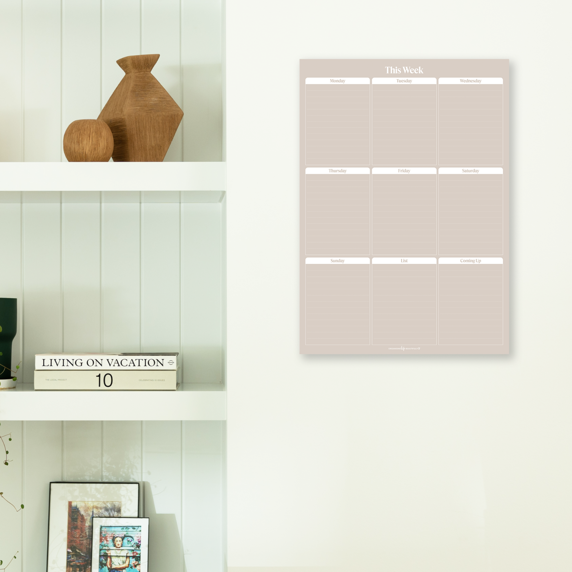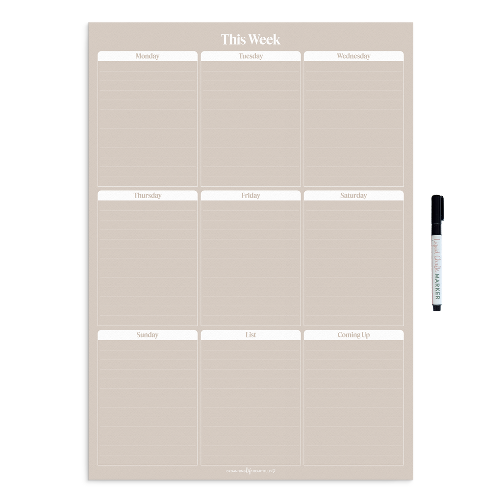 Designed to suit every lifestyle and space, these planners stick firmly to most smooth surfaces (like fridges, doors, cupboards, glass, white-goods and more), and can be repositioned as needed. No magnets, no frames, and no wall damage.