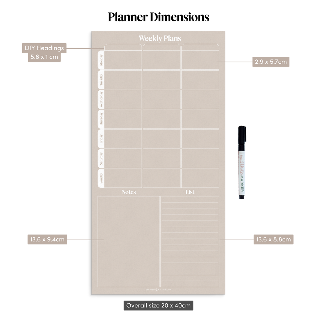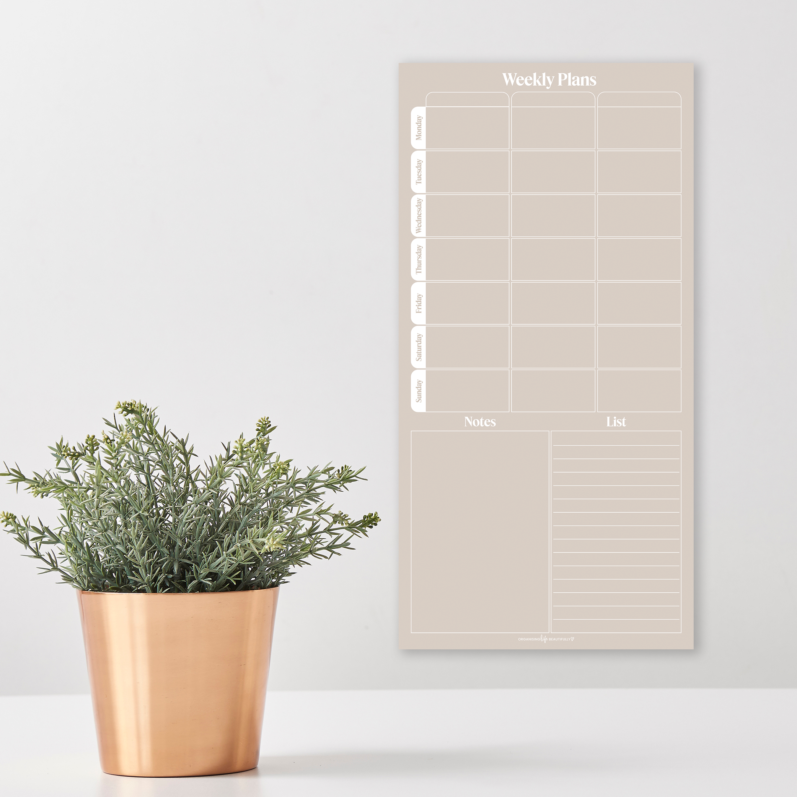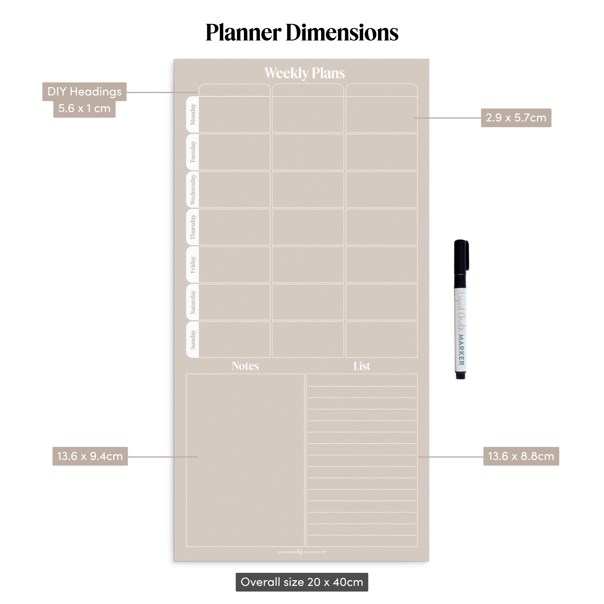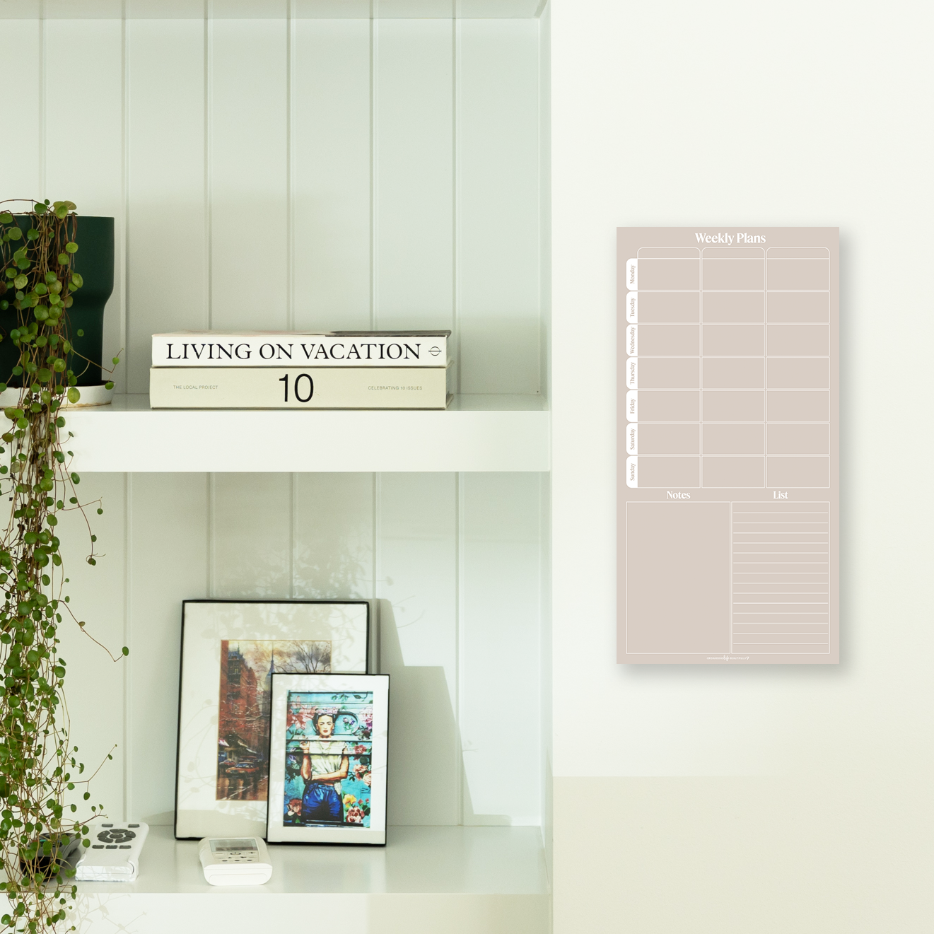 Designed to suit every lifestyle and space, these planners stick firmly to most smooth surfaces (like fridges, doors, cupboards, glass, white-goods and more), and can be repositioned as needed. No magnets, no frames, and no wall damage.
