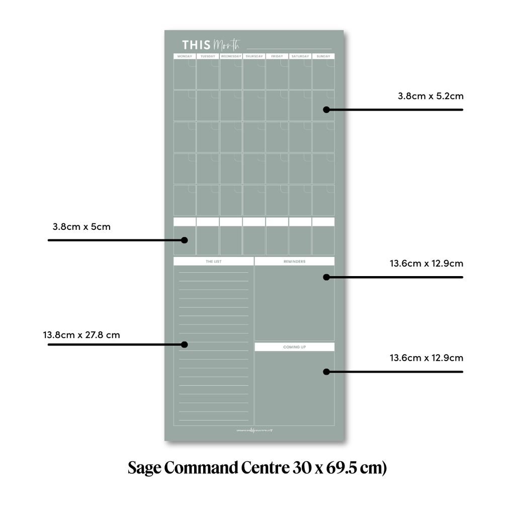 30x70cm Magnetic Family Command Centre – with a calendar, weekly planner, to-do list, reminders and coming up sections, so you can see your whole month at a glance.