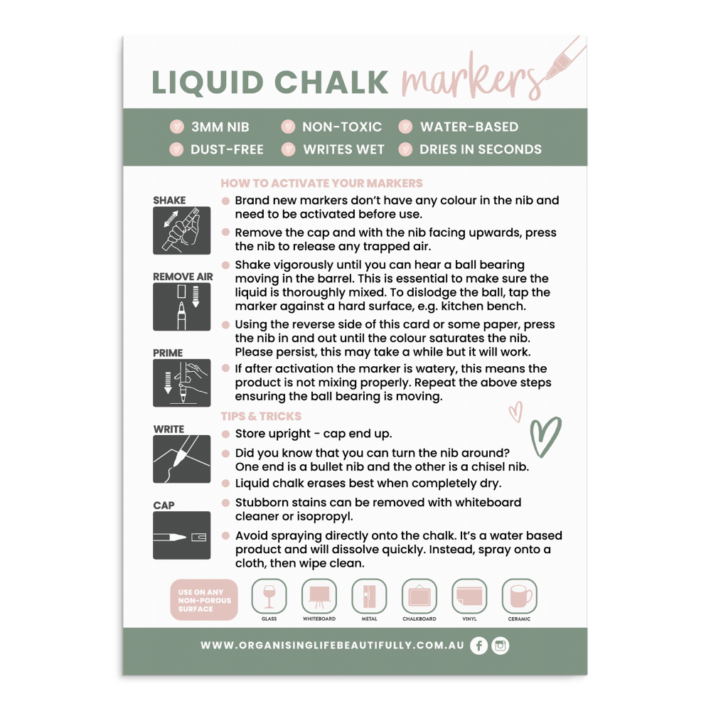 • Liquid chalk markers are the perfect tool to use on our magnet planners. It writes beautifully on the cello surface and can be wiped clean with a damp cloth. Whiteboard markers can also be used on most of our products with the exception of the classic black range.
